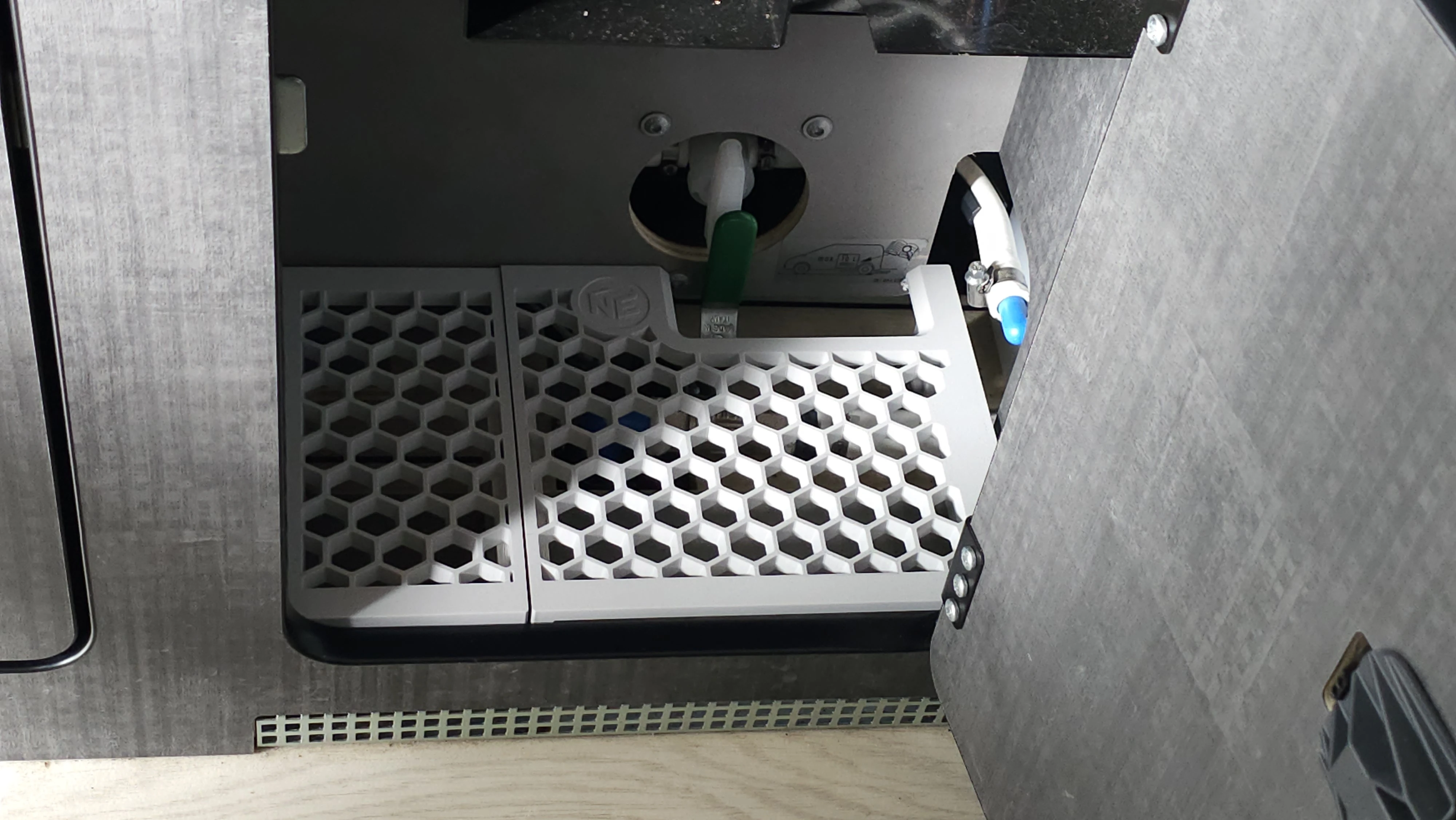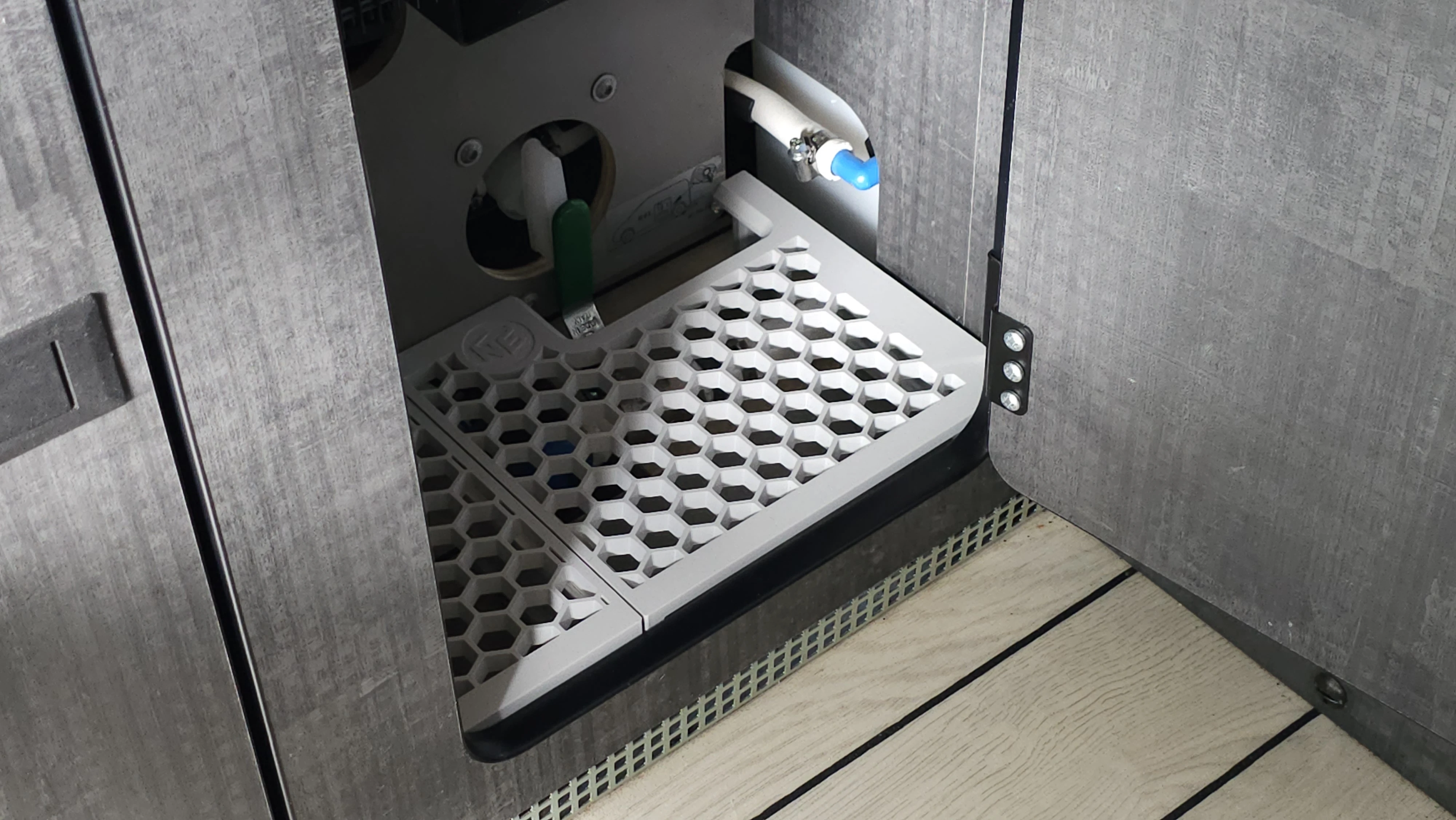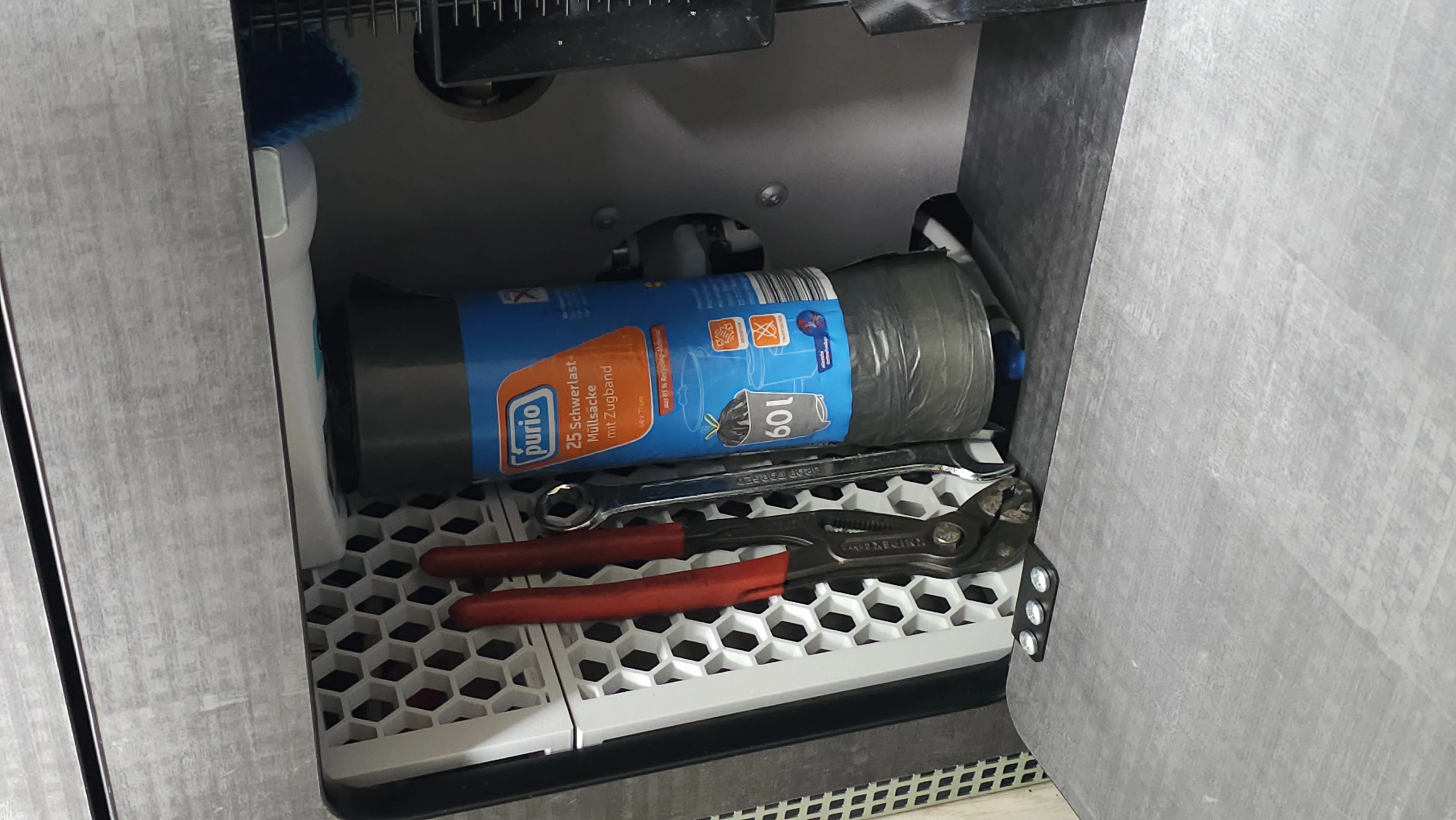 Mit dem Einsatz wird eine zweite flache Ebene geschaffen. Der zweiteilige Einsatz ist leicht zu entnehmen und somit kann der Raum darunter gut genutzt werden. Die Wasserhähne sind trotzdem gut zu erreichen.